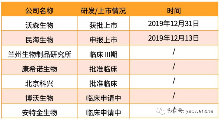 目前,国内除了沃森生物之外,还有包括民海生物、北京科兴、兰州所、智飞生物、康希诺以及成都安特金等在做13价肺炎疫苗的研发。从研发进展来看,民海生物13价肺炎疫苗处于临床总结报告阶段;北京科兴和兰州所该疫苗处于临床II期阶段;智飞生物处于15价肺炎临床I期阶段;康希诺处于13价肺炎临床I期阶段;成都安特金处于申报临床批件阶段。