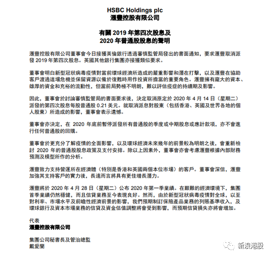 汇丰控股宣布,公司董事会昨日接获英伦银行透过审慎监管局发出的书面通知,要求汇丰取消派发2019年第四次股息。英国其他银行集团亦接获类似要求。