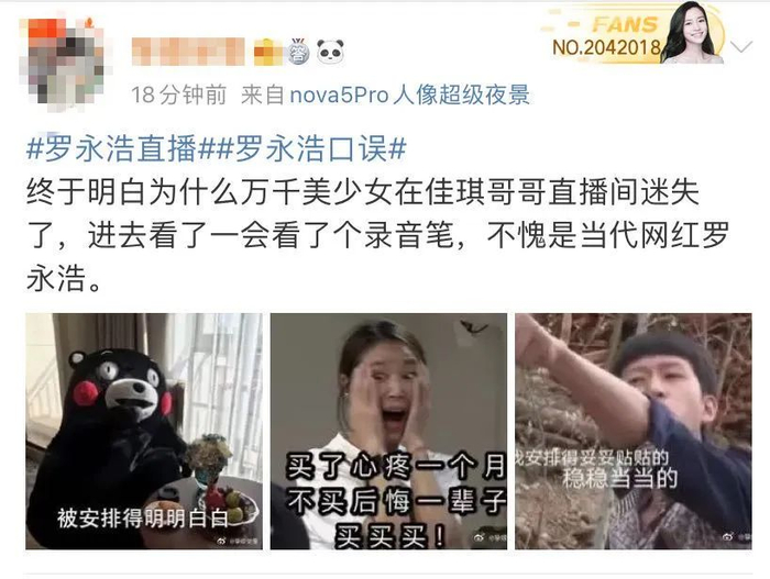 20年的老网红了,人气毕竟还是在的,但500万的粉丝里面80%是男的。罗老师的成在直男,短板也在直男。