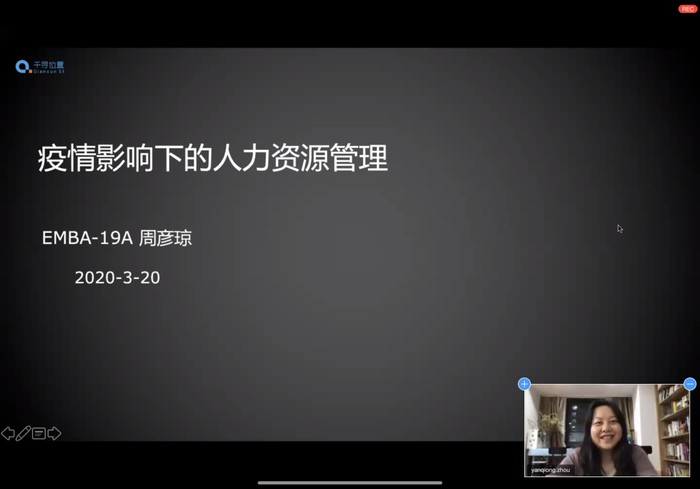 周彦琼同学就“疫情影响下的人力资源管理”主题进行分享。首先她介绍了千寻位置网络及其业务内容,结合其企业在疫情期间开展的员工关怀、IT响应、文化活动以及组织创新等方面的践行案例,分享了人力资源管理在积极应对疫情,保证企业组织管理及各项业务工作全面推进过程中的重大价值。最后,周彦琼同学提出了她的思考:“危”的背后是“机”;一场仗,一颗心;创新的土壤是包容、初心和目标。期间爆出不少人力资源管理的金句。周彦琼同学还指出了疫情后期发展几个重要方向,给同学们分享了很多自己的专业建议。