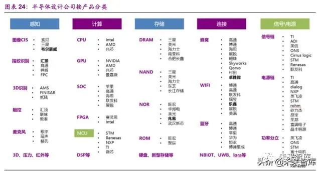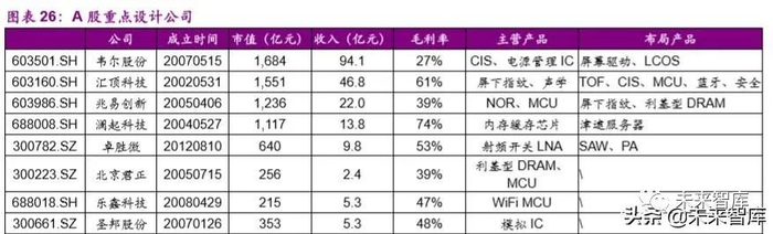 A 股中韦尔股份(豪威科技)在 CIS 领域全球第三,汇顶科技在光学屏 下指纹领域全球第一,兆易创新在 nor flash 领域全球第三,澜起科技在内存 缓存芯片领域全球第一,卓胜微在射频开关领域全球第三。从毛利率上看, 汇顶科技、澜起科技、卓胜微毛利率也超过了 50%。