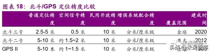 北斗三号组网卫星采用了更高性能的铷原子钟和氢原子钟,铷原子钟天 稳定度为 E-14 量级,氢原子钟天稳定度为 E-15 量级。三号定位精度提升至 2.5 至 5 米,较北斗二号提升一至两倍。另外,三号组网卫星通过采用星间 链路等新技术,空间信号精度可优于 0.5 米。