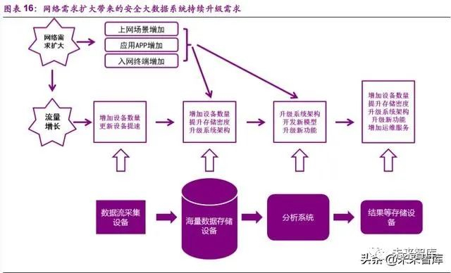 短期疫情影响,大众行为网络化趋势加速,网络态势感知、网络行为安 全的重要程度日益提升,长期受益于互联网流量及网络内容复杂度提升。从 前端采集到后端存储计算分析,流量增长带来网络可视化、安全大数据系统 持续升级需求,产业规模持续扩大。对数据的计算分析在深度和广度上的双 重增长,造成了计算量的几何级增长,给系统带来了巨大的压力和挑战。大 数据技术推动了存储、计算、网络功能的虚拟化,不同类型的数据需要不同 的处理和优化,催生了大量的融合计算需求。现有设备无法永久支撑越来越 大的数据量的存储、计算,需要不断对设备进行扩容、升级,同时新数据带 来的新功能开发需求不断出现,运维及服务等需求持续增加。