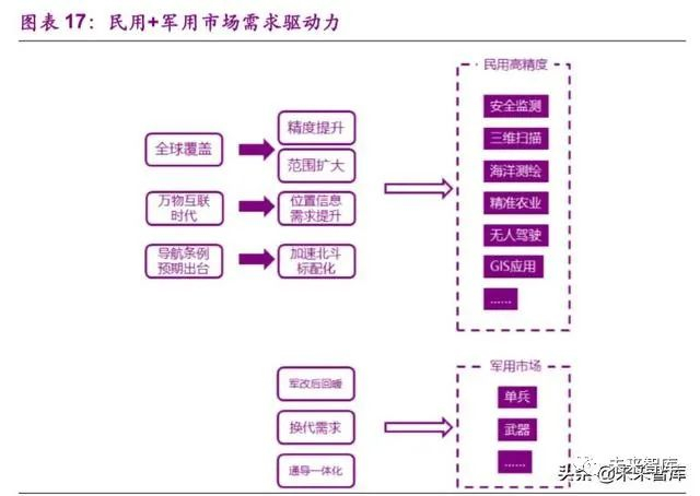 民用领域,北斗三号全球覆盖推动应用范围进一步扩大,性能精度进一 步提升,5G 万物互联加速位置信息需求提升,《导航条例》预期出台进一 步规范北斗标配化。军用领域,北三更新换代需求、通导一体化趋势进一步 带动北斗军用需求扩大。