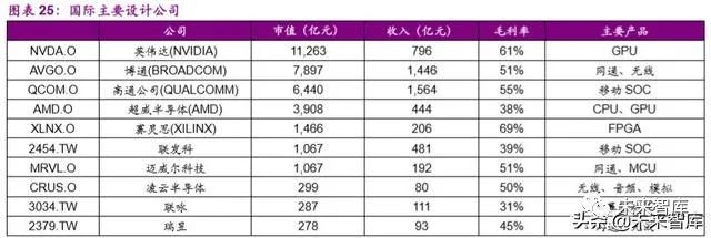 全球收入规模超过 10 亿美金的半导体设计公司很少,主要是由于半导 体行业细分领域市场规模以及行业集中度高的特点决定的。即便市场规模很 大的处理器领域,可以容下的厂商也比较少。比如 CPU 领域,除了 IDM 厂 商 intel 之外,设计公司里只有 AMD 一家独大;GPU 领域只有英伟达和 AMD 两家公司;移动 SOC 领域主要有高通、联发科以及国内未上市的海思和紫 光展锐。此外,还有少数几个领域的龙头比如 FPGA 领域的赛灵思、网通领 域的博通、迈威尔科技和瑞昱、屏幕驱动领域的联咏收入规模可以达到 10 亿美金以上。从毛利率上看,仅有英伟达、博通、高通、赛灵思、迈威尔科 技、凌云半导体等少数厂商超过 50%。