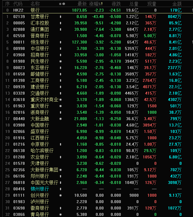 实际上,当天港股的银行板块除了极少数几家银行外,其他银行股几乎全线下跌。