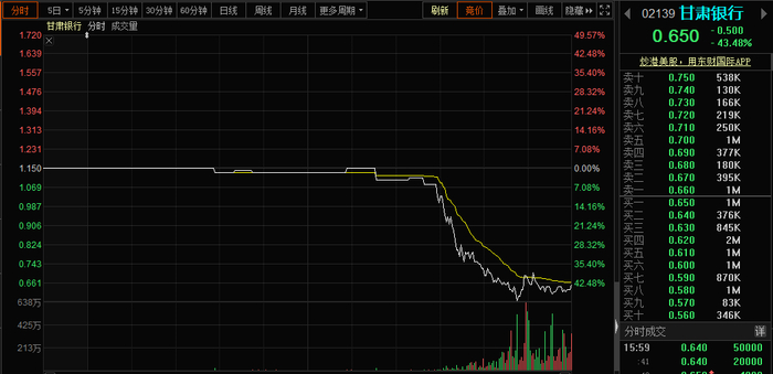 当天,甘肃银行以1.15元/股开盘,股价运行一直较为平稳,直到下午14时28分,开始出现连续跳水并跌破1港元/股,最低跌至0.58港元/股。后续,甘肃银行股价有所回升,截至收盘,股价收于0.65港元/股,全天下跌43.48%。