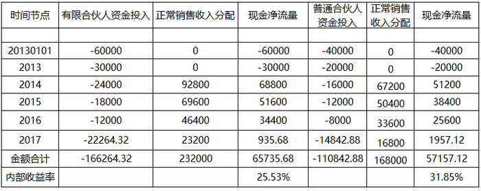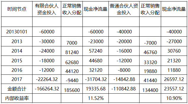 正常收益情况下,没产生会计收益不分红,每年销售收入按既定比例分配(当年产生的销售收入与投入的差额视同现金流分配),2014至2017年,每年年末,有限合伙人每年分配销售收入的58%,普通合伙人每年分配销售收入的42%,直至项目结束。