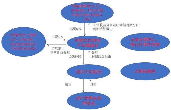 以基本的机构投资者与开发企业(或下属公司代表参与)共同成立房地产有限合伙股权投资基金为例,机构投资者为有限合伙人,开发企业为普通合伙人和私募基金管理人,100%控股一项目公司,股权投资方式为新设项目公司为例。