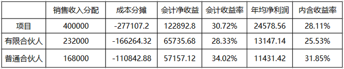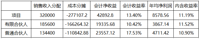 普通合伙人按项目销售收入的0.42倍进行分配,但第一年年末支付7000万元给有限合伙人,第二年至第四年每年年末少获得7000万元,第五年一次性补回28000万元,最终净收益为23557.12万元,普通合伙人投入资金的内含收益率为10.90%,普通合伙人投资(成本)收益率为17.53%。