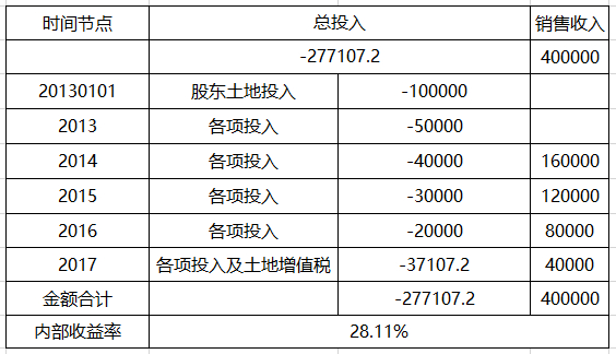 本案例主要比较项目清算利润率和内含收益率,项目运营期间产生的收入是销售或预售(预收账款)不影响案例分析,相关数据如下: