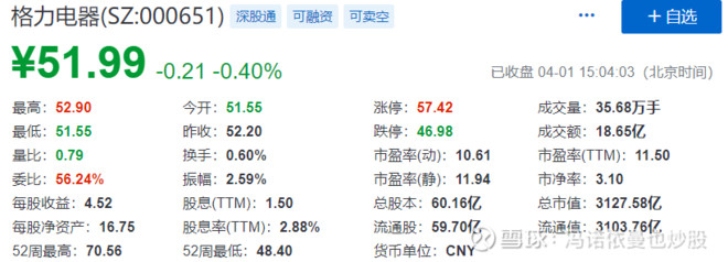 首先来看一下格力电器的基本面情况。市盈率11.50,不算高;市净率3.10有点高了,如果格力破产的话,那么投资者要亏掉将近三分之二的钱。毕竟现在股价52左右,每股净资产16.75。股息率2.88%,不算高。52周最高的股价70.56元,最低的股价48.40元,那么现在的股价还比较接近最低价,相对还算比较安全,但是也不排除之后会跌很多。不过这个跌很多的情况,在董小姐在位的时候可能不会存在,毕竟还有她的个人影响力存在。