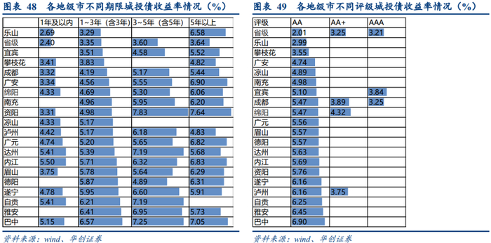 以上我们详细梳理了四川各个地级市城投平台的经营业务和财务指标,在此为更直观地了解四川省各地级市城投平台的存续债市场定价情况,我们选取截至2020年3月25日存续城投债的中债到期收益率估值,按照算数平均的方式,计算出各个地级市不同期限、不同主体评级的存续城投债平均到期收益率情况。