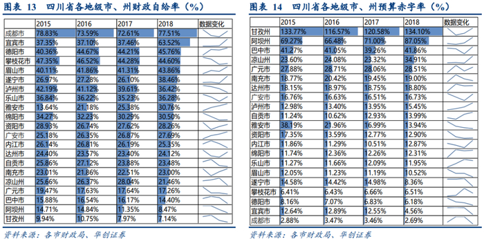 从财政自给率和财政赤字率来看,财政自给率各城市差别相对较大但总体较低,所有地级市均不能完全实现自给自足,仅成都市和宜宾市财政收入能满足大半财政支出,其余地区财政自给率均在50%以下,阿坝州和甘孜州位居末位,财政自给率不到10%,分别为8%和7%。与之对应的是预算赤字率,仅成都市和宜宾市预算赤字率在5%以内,除了德阳市、攀枝花市和遂宁市三个地级市的赤字率在10%以内,其余地级市的预算赤字率均大于10%。四川省各地级市财政自给率和预算赤字率整体表现相对较弱。