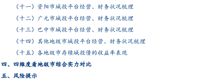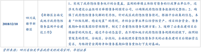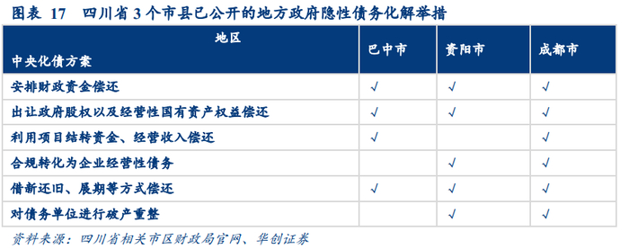 巴中市、资阳市、成都市在隐性债务化解方面提出了较为具体的措施。(1)巴中市南江县存量债务明确为2014年12月31日前未予以清偿完毕的债务:县人民政府负责统筹协调本行政区域范围内的政府性债务管理工作,推进政府性债务管理机制建设,审定债务举借方案,研究制定应急处置预案,组织实施债务管理考核。(2)资阳市研究制订非正常经营的市农投、市工投、市诚鑫等公司撤销方案。理顺雁通运务、怡然汽车租赁、市公交、市交投等公司出资关系,打造交通产业集团公司,稳妥推进融资平台公司“撤、并、转”;研究制订非正常经营的市农投、市工投、市诚鑫等公司撤销方案,力争市本级全年筹集资金42亿元偿还存量债务。(3)成都市新都区通过安排财政资金、经营性国有资产权益、资产处置收入、将具有稳定现金流的债务合规转化企业经营性债务等六种方式确保隐性债务在10年内消化完毕。