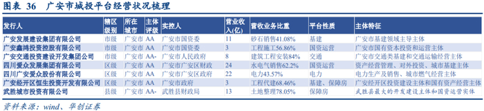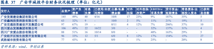 广安市位于四川省东部,以建材业、装备制造业、农产品加工业、煤炭业、电力、食品饮料、先进材料为七大支柱产业,知名企业有科伦药业、星星建设、比亚迪、光前集团等,广安全市共3个城投平台,其中有1个市级城投平台,1个区级城投平台,1个县级市城投平台。广安市总面积6339.22平方千米,下辖2个区(广安区、前锋区),3个县(岳池县、武胜县、邻水县),代管1个县级市(华蓥市),2018年广安常住人口达到324.1万人。广安下辖的区县近些年发展较快,尤其是邻水县已连续4年名列广安区县第一,是中国西部的百强县,广安经济技术开发区于2010年经国务院批准为国家级经济技术开发区,是四川省唯一的川渝合作示范区和四川省气盐结合的精细化工基地。