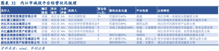 内江位于四川省东南部,沱江下游中段,冶金建材、机械制造、医药化工、食品饮料、电力能源是其五大支柱产业,巨腾国际、浩物股份、白马电厂等一批知名企业相继落户,内江全市共8家城投平台,其中有2家市级城投平台、3家区级城投平台、1家县级市城投平台和2家县级城投平台。内江市幅员面积5385平方公里,内江市下辖2个区(市中区、东兴区)、2个县(资中县、威远县),代管1个县级市(隆昌市),2018年内江常住人口达到411.77万人,在西部百强县中内江威远县排名第59名,内江经济技术开发区是于2013年经国务院批准升级为国家级经济技术开发区,于2020年被工信部评定为国家新型工业化产业示范基地。