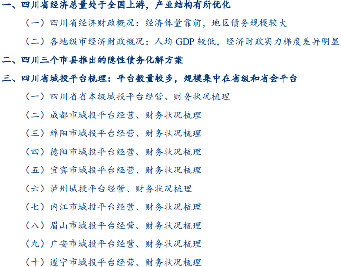 目前通过公开渠道整理搜集,全国已有超过60个市县开展隐性债务化解工作,其中四川地区有3个对应地区的债务化解方案,分别为巴中市南江县、资阳市和成都市新都区,就各地区的债务化解方案,从以下四个方面分析: