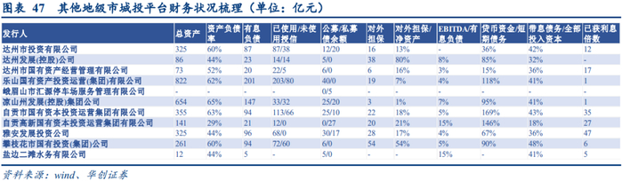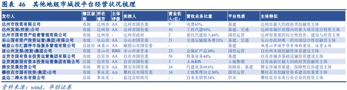 除上述地级市外,四川省其余地级市城投平台数量较少,其中达州全市共3家市级城投平台,峨眉山全市共1家市级城投平台,乐山全市共1家市级城投平台,凉山彝族自治州共1家市级城投平台,自贡市有1家市级城投平台和1家区级城投平台,攀枝花市有1家市级城投平台和1家县级城投平台,雅安全市共1家市级城投平台。总体看来,达州、乐山、凉山、自贡、攀枝花和雅安城投有息负债体量较小,地方财力相对较低。