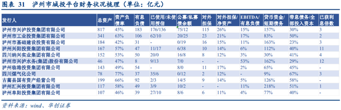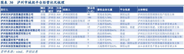 泸州市是川滇黔渝结合部的区域中心城市,成渝经济圈重要的商贸物流中心,四大支柱产业分别是酒类制造业、化工产业、机械制造业、能源行业,知名企业有郎酒集团、北方化工、天然气化工等,泸州全市共11个城投平台,其中包括6个市级城投平台、2个区级城投平台和3个县级城投平台。泸州总面积12232.34平方公里,下辖3个区(江阳区、龙马潭区、纳溪区)、4个县(泸县、合江县、叙永县、古蔺县),2018年泸州市常住人口达到432.36万人,泸州高新技术产业园区位于泸州市龙马潭区,是省级开发区、四川省重点招商园区、四川省百亿产值园区、是四川省承接产业转移的先进园区。