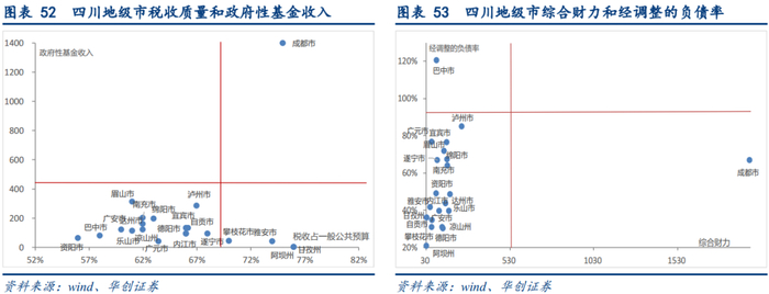 第五,广元、巴中、阿坝州和甘孜州归于第五档。经济发展水平弱于前列地区,GDP水平排名在全省均靠后,其中阿坝州和甘孜州的财政自给率排在末位,广元和巴中的经调整债务率居省内前四,债务负担较重。