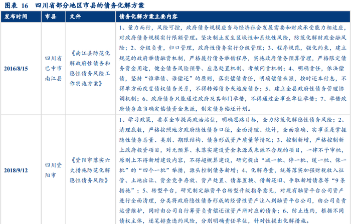 据公开资料整理,四川省3个地区公开的隐性债务化解方案,分别为巴中市南江县、资阳市和成都市新都区。四川省地区债务化解方案中所有地区都对控制债务规模、防控债务风险方面进行了探索,所有地区都在隐性债务化解方面提出了较为具体的措施,所有地区明确提出债务化解目标,部分地区偿债责任明晰,谁借谁还,风险自担,例如巴中市南江县和资阳市,巴中市南江县债务风险防控建立评估预警报告制度、体系完善。