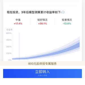 据悉,“帮你投”开创了“100”理财服务模式,即1分钟匹配投资建议,几乎0门槛购买。系统会给每一个投资者做风险测试,根据结果给出不同的目标收益率的建议,以及推荐匹配的基金组合。投资者选择自己认可的建议,转入拟投资的金额,接下来所有的投资操作都将由“帮你投”背后的智能模型和专业团队完成。