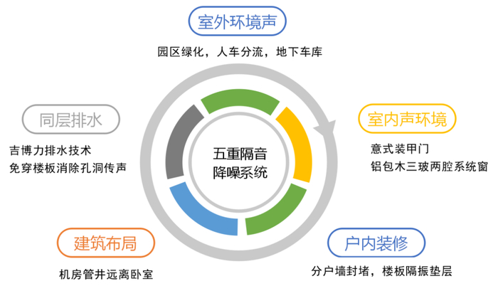 图 11 金茂绿金科技健康住宅五重隔音系统(来源:笔者根据绿金科技健康白皮书自绘)