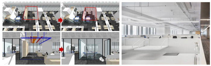 疫情期间的灵活的线上办公体验和习惯一定程度上会保留下来,影响企业员工对空间功能的需求和预期。因此应设计灵活、高效、便捷的办公空间,满足企业需求。例如减少空间的隔断,增加空间的灵活性,设计模数化的卡位和弹性的讨论区,有利于有限空间内员工数量的疏导与转换,提升工作效率。