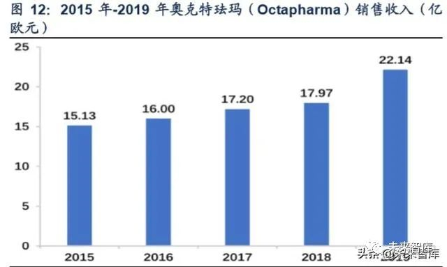 据公司年报,奥克特珐玛(Octapharma)在 2019 年表现强劲,在三个治疗领域均实现良好增长,2019 年全球销售收入 22.14 亿欧元,较 2018 年增加 4.17 亿欧元(23.2%)。
