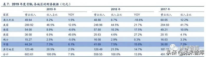 根据 CSL 2017-2018 年年度报告,CSL 在中国的营业收入稳健增长。2019 年 CSL 在中国地区的营业收入为 44.24 亿元(主 要为白蛋白产品销售),同比增长 6.1%;2018 年营业收入 41.69 亿元,同比增长 15.8%。2017~2019 年 CSL 中国地区的营 业收入均占全球的 7%左右。