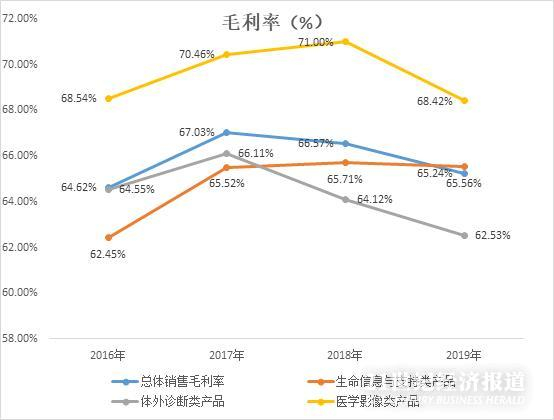 具体到各个主营业务的毛利率情况,可以发现在近两年,总体毛利率呈现下降态势,去年毛利率保持上升的医学影像产品今年也步入了下降通道,而体外诊断类产品毛利率下降幅度较大。