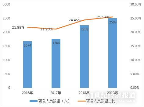 研发人员由2016年1674人增加至2019年2508人,增幅近50%。此外,公司的研发人员占公司员工总数超过四分之一。2500人的研发团队,处于同行业首位,比第二名乐普医疗高出500人左右。