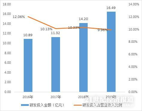 研发费用方面,2019年迈瑞医疗研发费用为16.49亿元,同比增加2.29亿元,占营收的9.96%。尽管研发投入占营收比未见明显增长,但研发投入金额一直在持续增加。