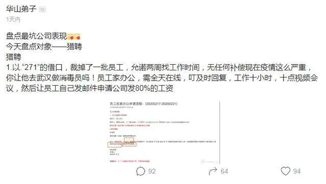 有网友表示,猎聘要求员工家办公,需全天在线,叮及时回复,工作十小时,十点视频会议,然后让员工自己发邮件申请公司发80%的工资。
