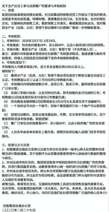2月27日,有苏宁员工表示,苏宁发布关于全产业员工参与社群推广的要求和考核机制。对象是苏宁集团全产业(总部、大区)管理干部(不含终端人员),时间为2020年2月27-29日,标准为人均保底2单,且订单总金额达到1000元以上。
