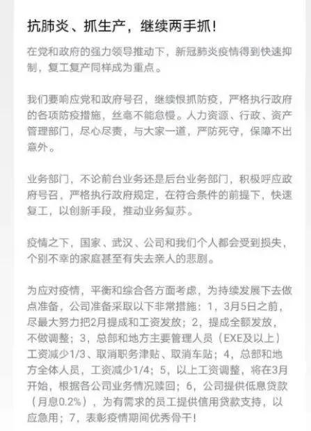 2月24日,水滴公司CEO沈鹏在内部信中表示,春节期间高管们一致决定,自愿降薪20%,与公司一起共克时艰!