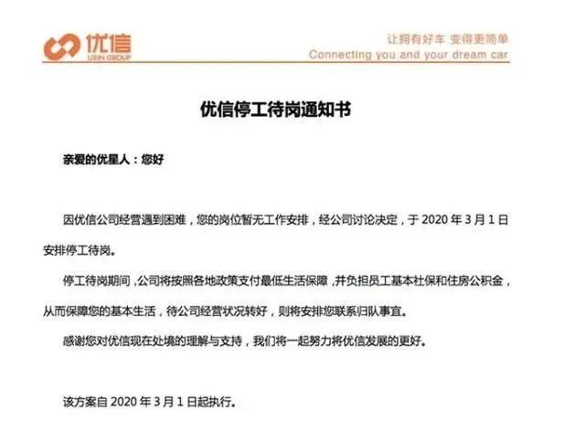 2月28日,优信发出“停工待岗通知书”的内部邮件,称“因公司经营遇到困难,岗位暂无工作安排,优信于3月1日安排停工待岗。停工待岗期间,将按照各地政策支付最低生活保障,并负担员工基本社保和住房公积金,从而保障员工基本生活,待公司经营状况转好,再安排复岗事宜。”