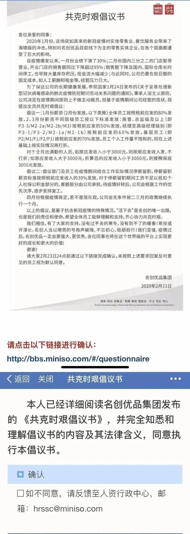 2月21日,名创优品发出《共克时艰倡议书》,倡议一:1月份薪资发放80%,2月份薪资发放50%―70%不等;倡议二:结合工作实际停薪留职,发放30%工资。