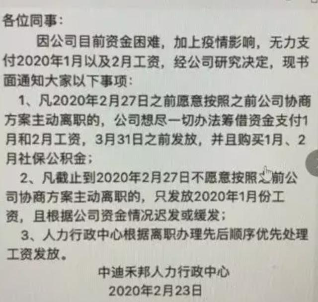 2月23日,中迪禾邦人力行政中心发布消息称,无力支付2020年1月、2月工资,员工主动离职的,在3月31日前发1月和2月工资。不愿主动离职的,只发放1月份工资,且迟发或缓发。