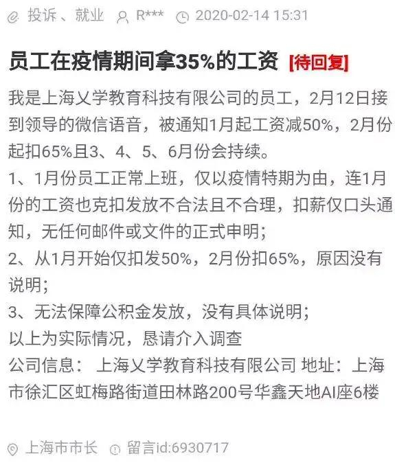 2月14日,有员工向上海市市长邮箱投诉,称1月份员工正常上班,仅以疫情特期为由,连1月份的工资也克扣发放不合法且不合理,扣薪仅口头通知,无任何邮件或文件的正式申明;从1月开始仅扣发50%,2月份扣65%,原因没有说明;无法保障公积金发放,没有具体说明。