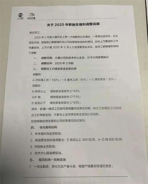 3月5日,上汽大通《关于2020年薪酬及福利调整说明》在网上传播开来。说明指出,从2020年3月起调整大通公司及技术中心全员的月绩效奖金发放比例,取消年休假补贴和书报券、技术中心服装费,调整高温费发放标准等。