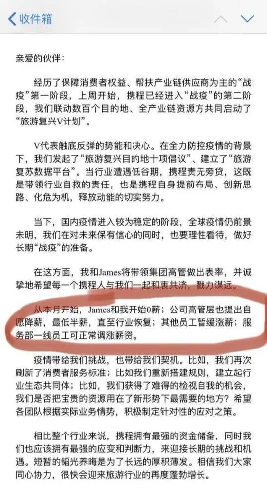 3月9日,携程发出内部信称,携程联合创始人、董事局主席梁建章、携程集团CEO孙洁开始0薪;公司高管层提出自愿降薪,最低半薪,直至行业恢复;其他员工暂缓涨薪;服务部一线员工可正常调涨薪资。