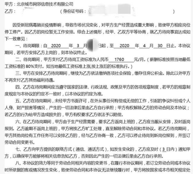 有消息称,瓜子二手车还与员工签订待岗协议,期限自3月1日到5月1日,首月支付1700元生活费,次月起按月支付1190元生活费。