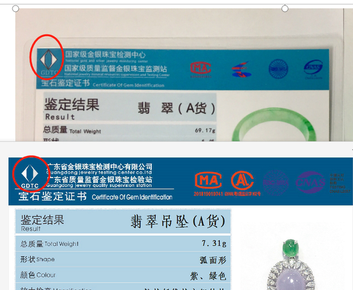 广东省金银珠宝检测中心的网址后缀为.cc,而国家级金银珠宝检测中心的网址不仅多了个zj,后缀也变成了.com,几个字母不同,却是千差万别。对比GDTC标志和网址的不同,基本可以认定,国家级金银珠宝检测中心仿冒广东省金银珠宝检测中心的鉴定证书。
