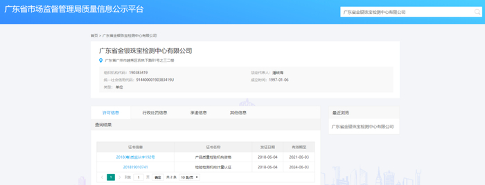 而在广东省市场监管局官网上,我们可以查到广东省金银珠宝检测中心有限公司确实是存在且具备资质的。