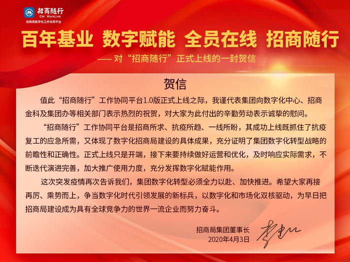 一场肆虐全球的新冠肺炎按下了这个世界的暂停键,打乱所有人和企业的工作节奏。集团数字化团队在疫情中逆势而上,近百人的团队加班加点,成功打造集团 数字化工作协同平台——招商随行(CM WorkLink),今天1.0 版本正式发布。集团董事长李建红发来贺信,总经理胡建华、副总经理王宏分别寄语,祝贺招商随行正式发布,寄语招商随行乘势而上、勇攀高峰。