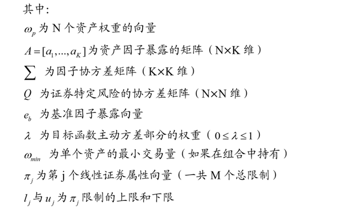 我们将确定最优资产权重的目标函数定义如下:使得平方因子暴露偏差与主动风险项的和最小,其中平方因子暴露偏差指的是相对于因子基准的因子暴露偏差的平方,主动风险项是惩罚系数λ乘以投资组合相对于因子基准的主动风险。