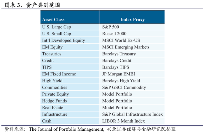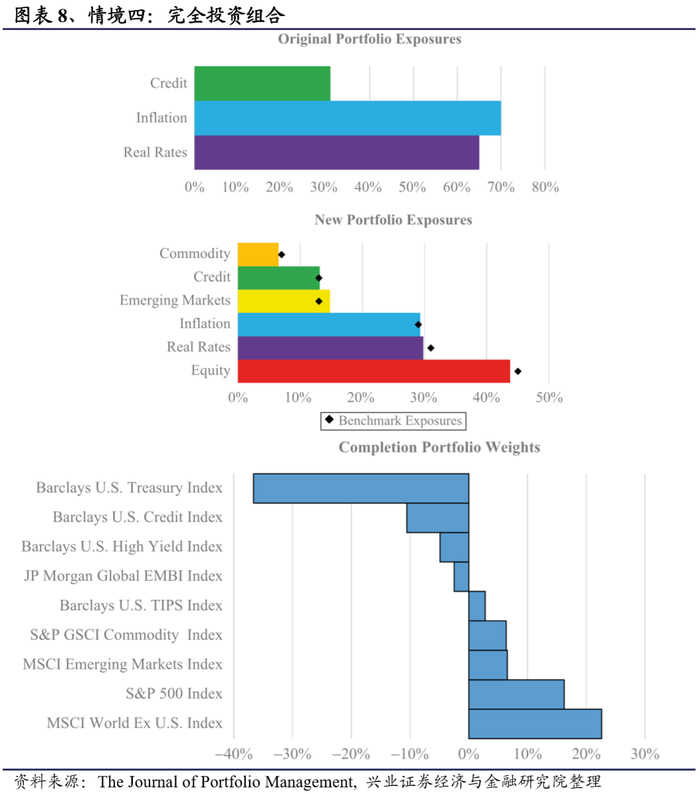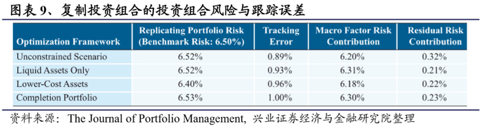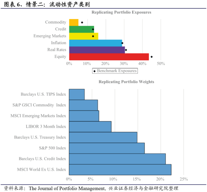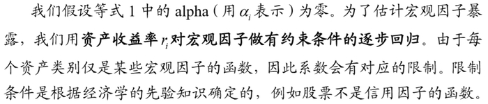 3、 本文使用了6个宏观经济因子(股权、实际利率、信用、通货膨胀、新兴市场和商品),首先根据标准线性因子模型,通过逐步回归获得了各个资产类别对宏观因子的暴露;然后利用带有约束条件的最优化算法,在给定目标因子暴露的情况下,以资产组合的因子暴露偏差与主动风险项之和最小为目标,得到最优的资产组合配置;相关投资约束条件可以包含对非流动性资产、最小交易量、纯多头、费用率等方面的限制,使得结果能更好地应用于实际投资。