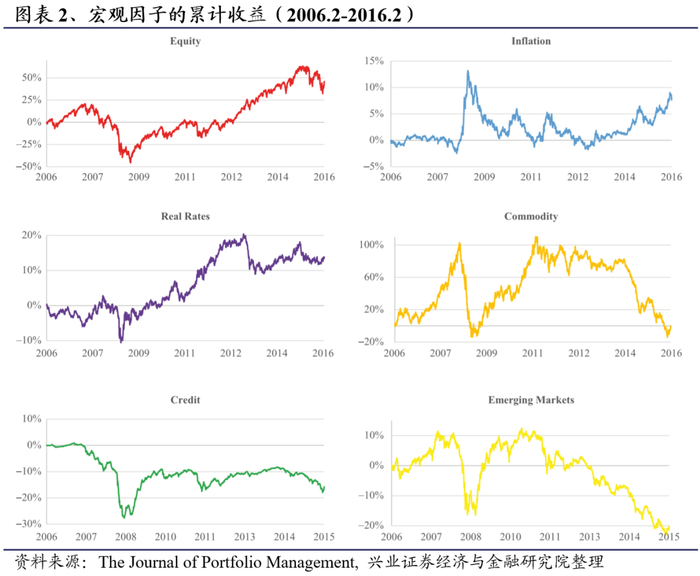图表2展示了宏观经济因子的历史累计收益。这些因子在经济周期的各个时期表现出了不同水平的波动性和收益情况。从2014年开始,大宗商品和新兴市场均出现明显下滑。但是在2015年,通货膨胀率和实际利率因子分别出现了稳定的回报。